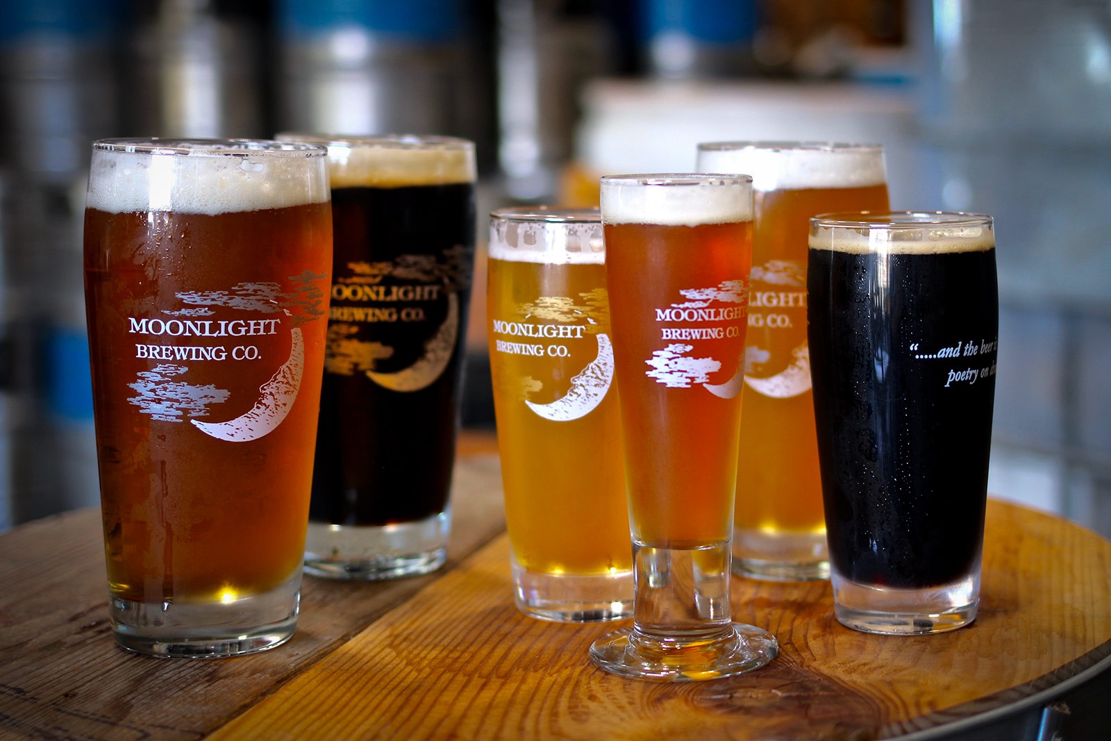 Our 21-barrel brewhouse uses a single-step infusion (British-style) method followed by boiling in our solid copper kettle. In the kettle, we add some from the dozen hops we buy from the U.S. and Germany. Occasionally, we also add our redwood branch tips, cedar branches, fruit, or other herbs.