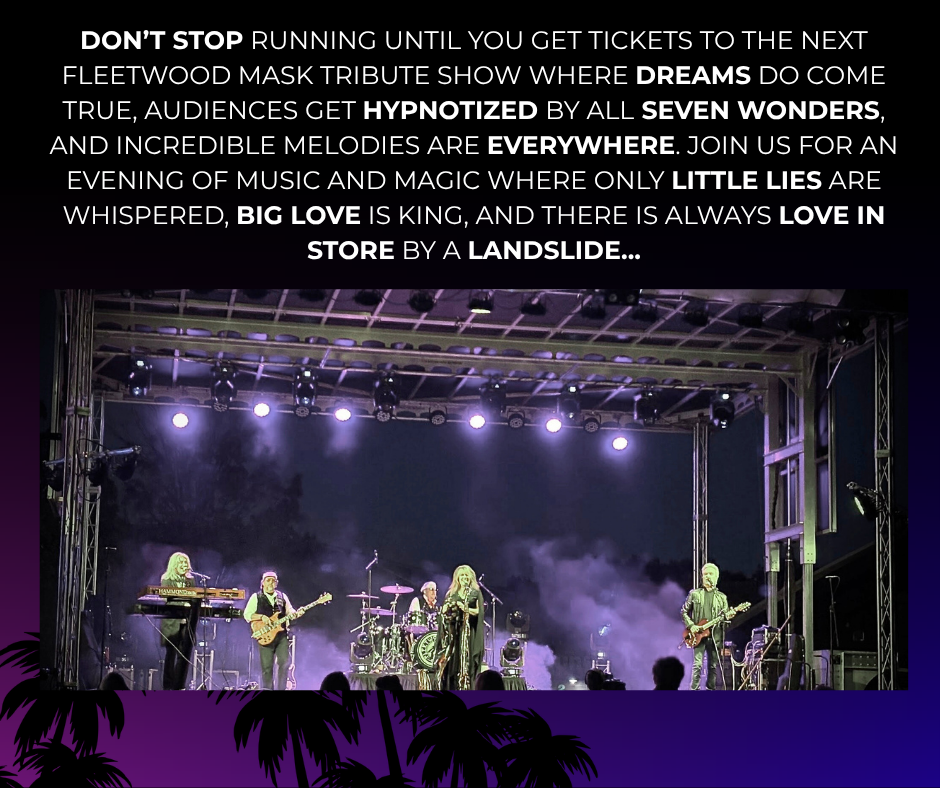 Fleetwood Mask concerts contain the hits, fan favorites, and deep cuts to satisfy even the most discerning of Fleetwood Mac aficionados. Attendees may also experience various show productions as Fleetwood Mask presents specific tributes to Fleetwood Mac’s 1980 Tusk tour, the 1982 Mirage tour, and the 1997 Dance reunion tour as part of their live concert packages.