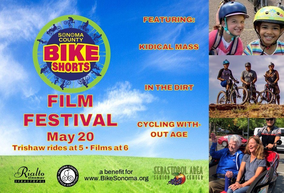 Join us for an evening that celebrates the joy of cycling at ANY age! On Wednesday, May 20th at 6:00pm, the Sonoma County Bicycle Coalition is hosting its first annual Bike Shorts Film Festival at Rialto Cinemas in Sebastopol. This evening is a benefit to raise funds for the coalition’s work to support our bike education and advocacy work, and features films on cyclists from 5 years old to seniors. The Sebastopol Senior Center’s Cycling Without Age Team will also provide FREE trishaw rides before the screening.