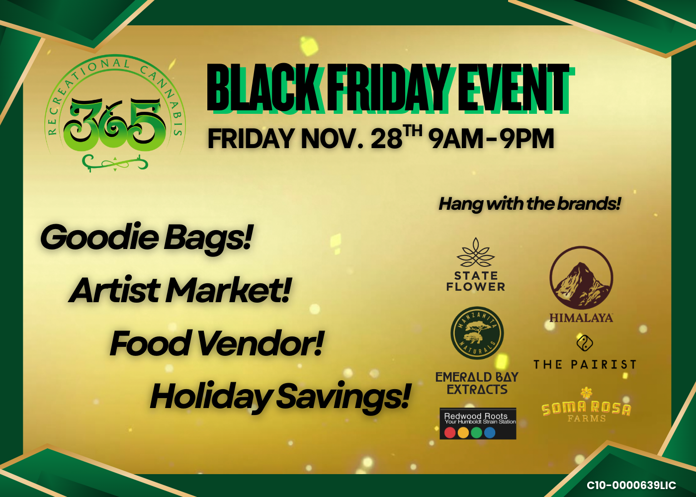 The holiday season is hitting hard at 365 Recreational Cannabis! Stop in for good vibes, big energy, and a crew ready to help you make this holiday season unforgettable. And don’t miss our massive Black Friday event on Friday, November 28th! Enjoy food, local art vendors and the best savings of the season. Fly high with the hive at 365!