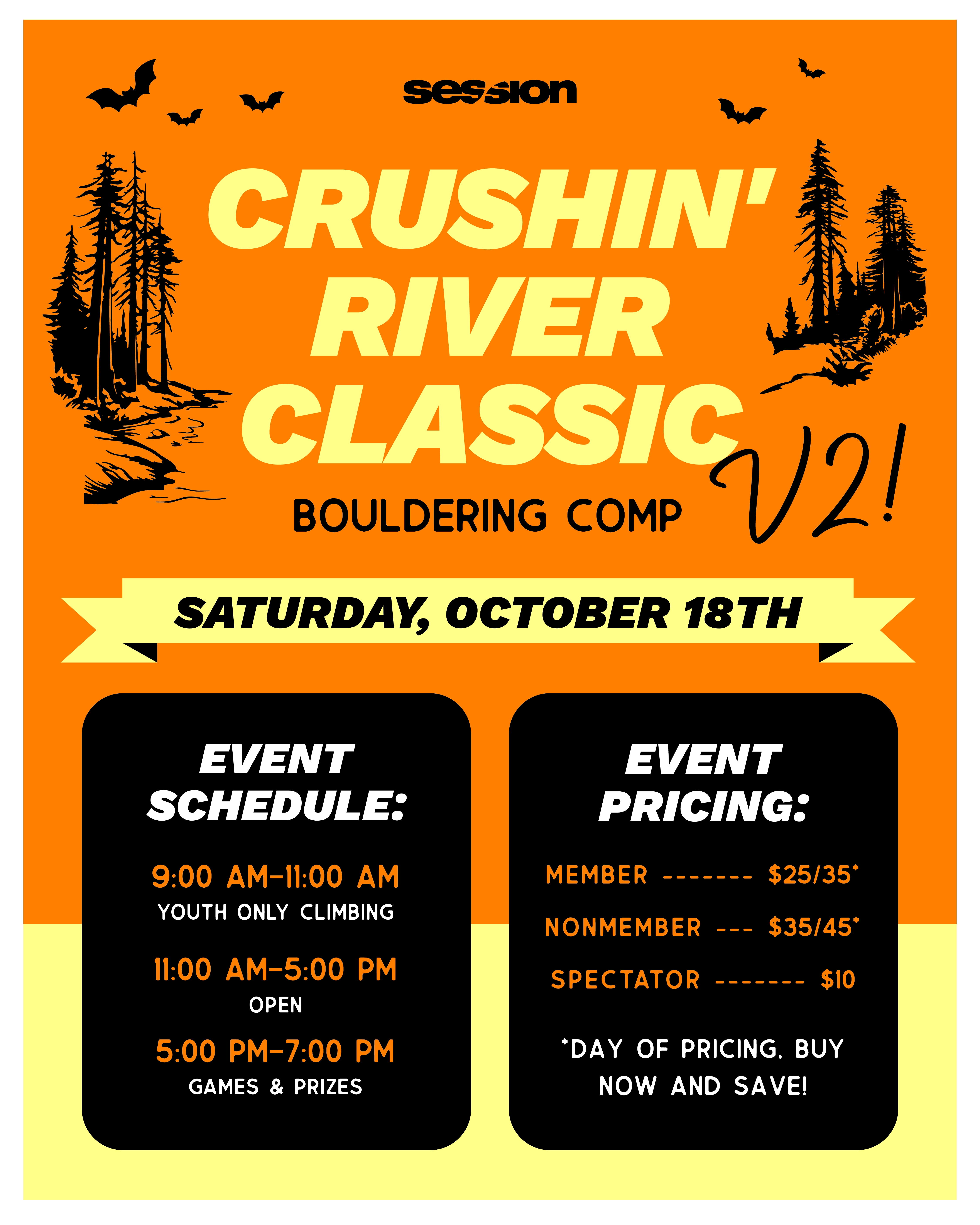 Welcome back to the second annual Crushin' River Classic bouldering competition! Get ready to throw down with your friends on brand-new boulders for a chance to win some exciting prizes! Whether you're coming to win it all or just eat some good food (or both!), there's something for everyone to enjoy! Join us on Saturday, October 18th for a full day of Time Well Spent.