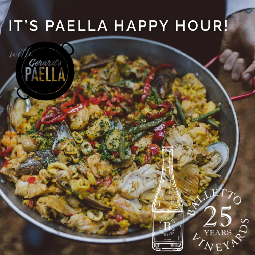 It's a Paella Party, celebrate happy hour with us at Balletto Vineyards! Surrounded by friends and good vibes, enjoy good eats and dancing with a fun local band while we toast to the exciting signs of Springtime in Wine Country on our Olive Terrace. Throughout the evening, Chef Gerard, of Gerard's Paella will cook us up a feast as we raise a glass to our new spring wine releases - perfectly paired with the paella. 4'oclock doors open and our wine reception and live music begins. Food service from 4:30-6:30pm and we wrap up the fun by 7pm.