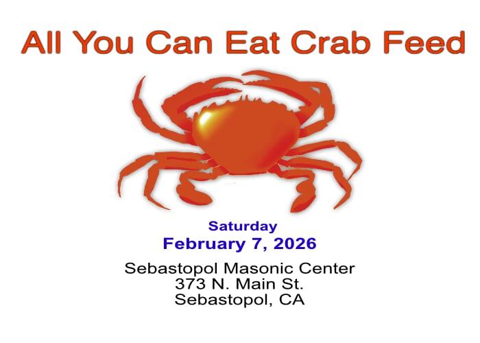 Sebastopol Masonic Lodge is hosting or our annual all-you-can-eat Crab Feed February 7th with two seating’s and takeout orders. Enjoy crab, home-made pasta, salad and garlic bread family style. Refreshments available for purchase.
