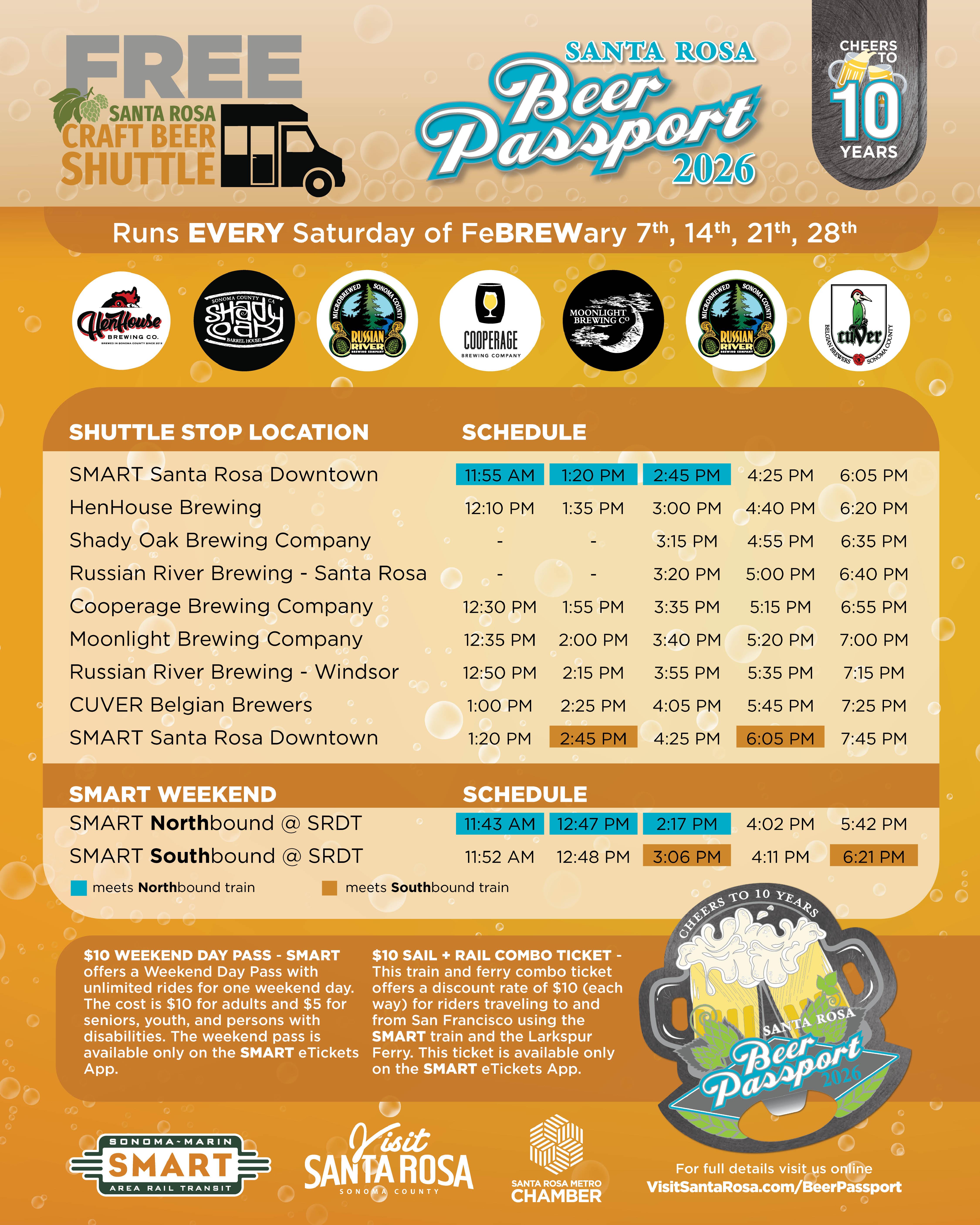 The free Santa Rosa Craft Beer Shuttle makes brewery hopping easy and worry-free! Ride with a built-in designated driver while exploring local favorites. Each stop lets you check in, collect points on your Santa Rosa Beer Passport, and discover new brews, all while getting around safely, responsibly, and at no cost.