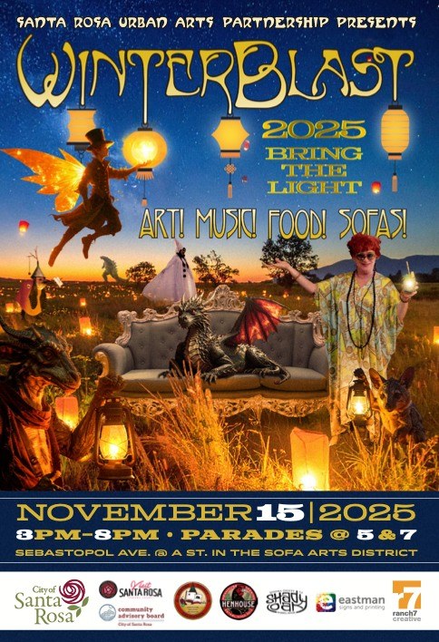 WinterBlast is an all inclusive kick-off to the Holiday Season. The SofA parades were started by the local artists in the district as a fun way to utilize the neighborhood name, South of A Street (SofA), and bring attention to an overlooked area of town. The parades and the event that has developed around them, has grown into a beloved Santa Rosa festival. Everyone is invited to participate, whether by being a spectator, dressing up, or building a lighted up sofa on wheels to push through the streets. Visitors are invited into the many artists' open studios from 3-5 pm and encouraged to enjoy the multiple offerings of food and beverages. Many of the participating businesses have bands or special performances happening between parade times. The event brings together dozens of creative communities from the greater Bay Area that put together elaborate sofas on wheels, organized and lighted themed walking battalions, and marching bands.